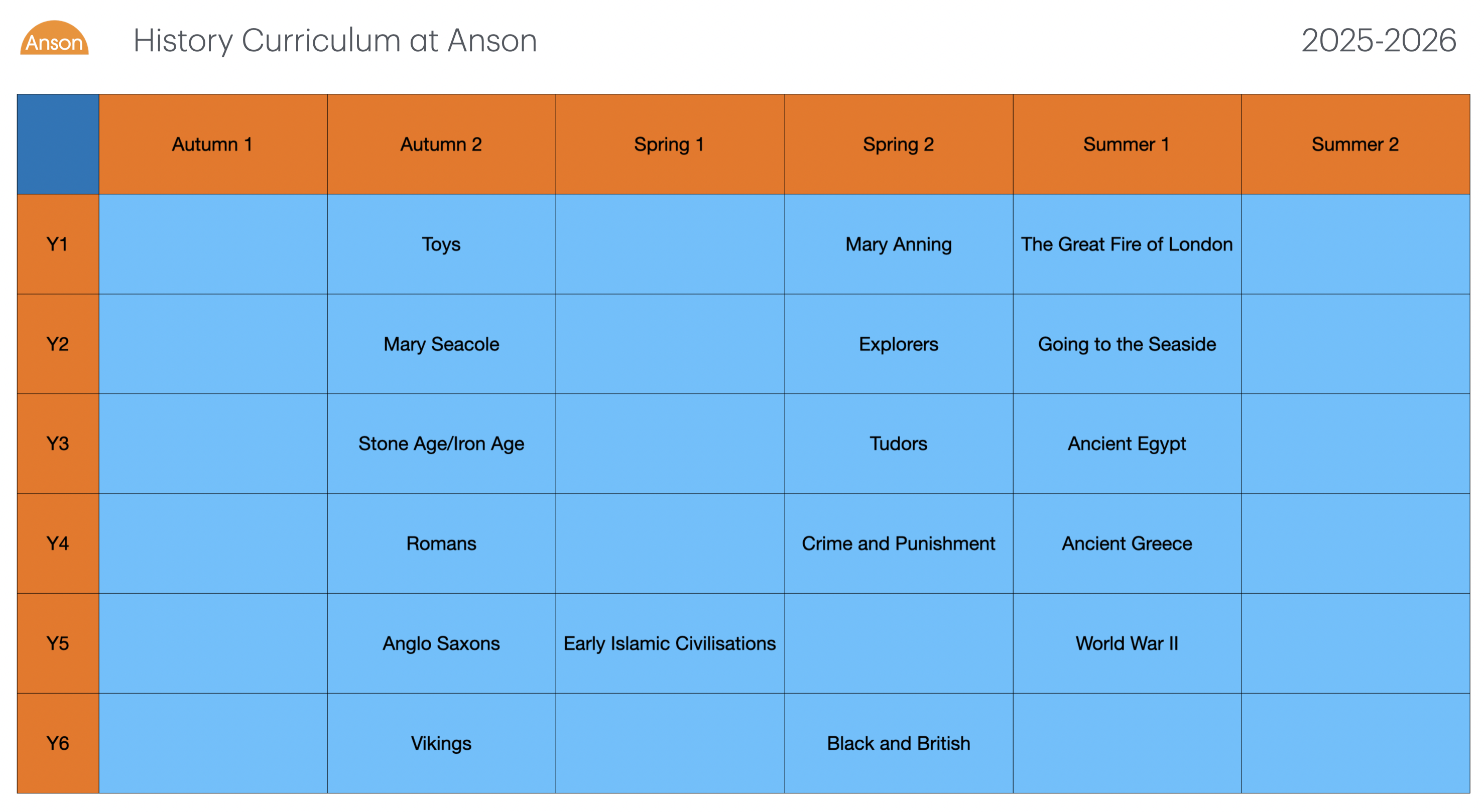 At Anson our history education helps pupils gain a coherent knowledge and understanding of Britain’s past and that of the wider world.
