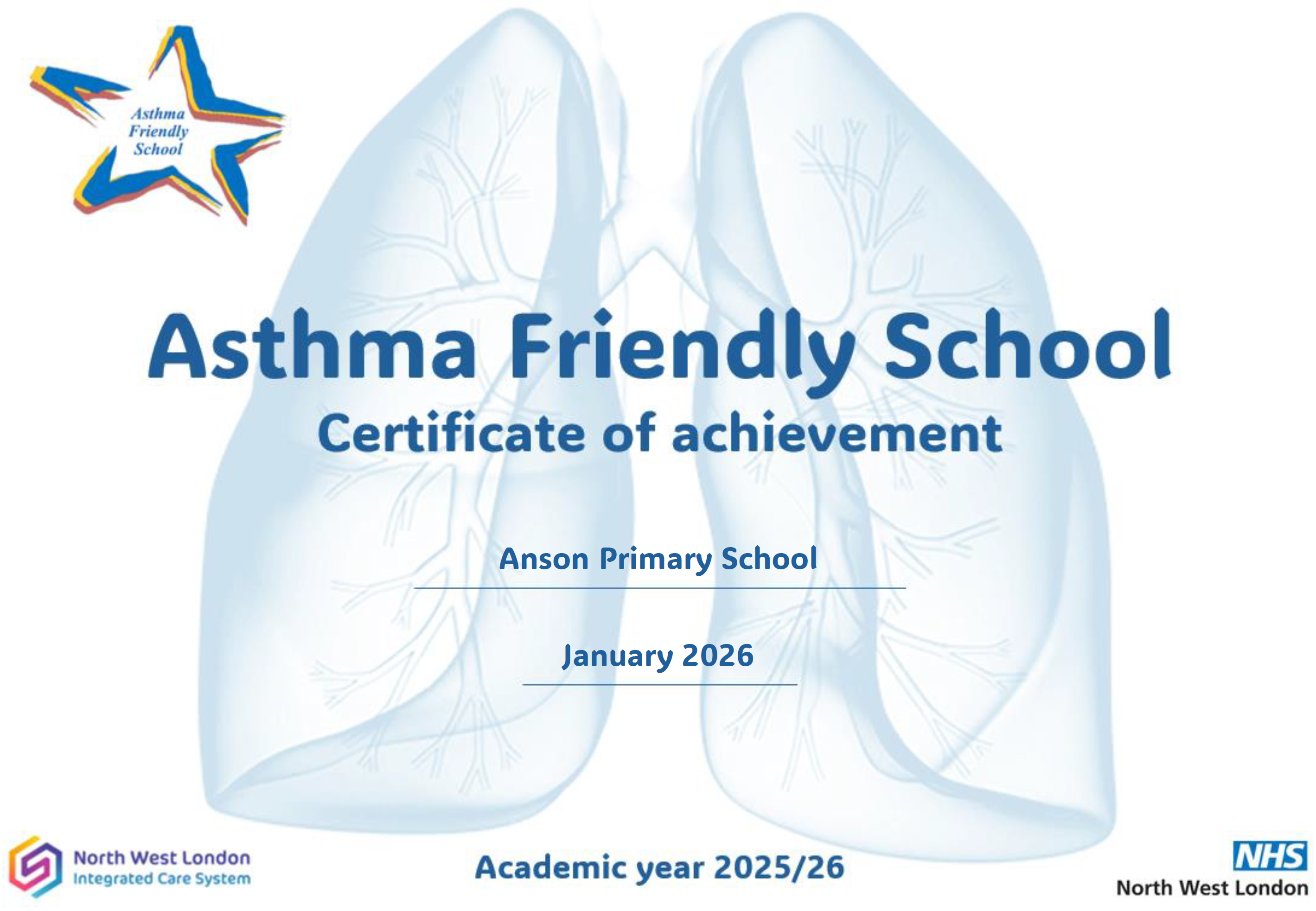 Anson Primary School is proud to be recognised as an Asthma Friendly School, reflecting our strong commitment to the health, safety and wellbeing of every child. This means we have clear policies and procedures in place to support pupils with asthma, staff are trained to recognise symptoms and respond quickly in an emergency, and children are encouraged to manage their asthma confidently and safely. We work closely with families and health professionals to ensure each child’s needs are understood and met, so that all pupils can take part fully in school life with reassurance, support and care.