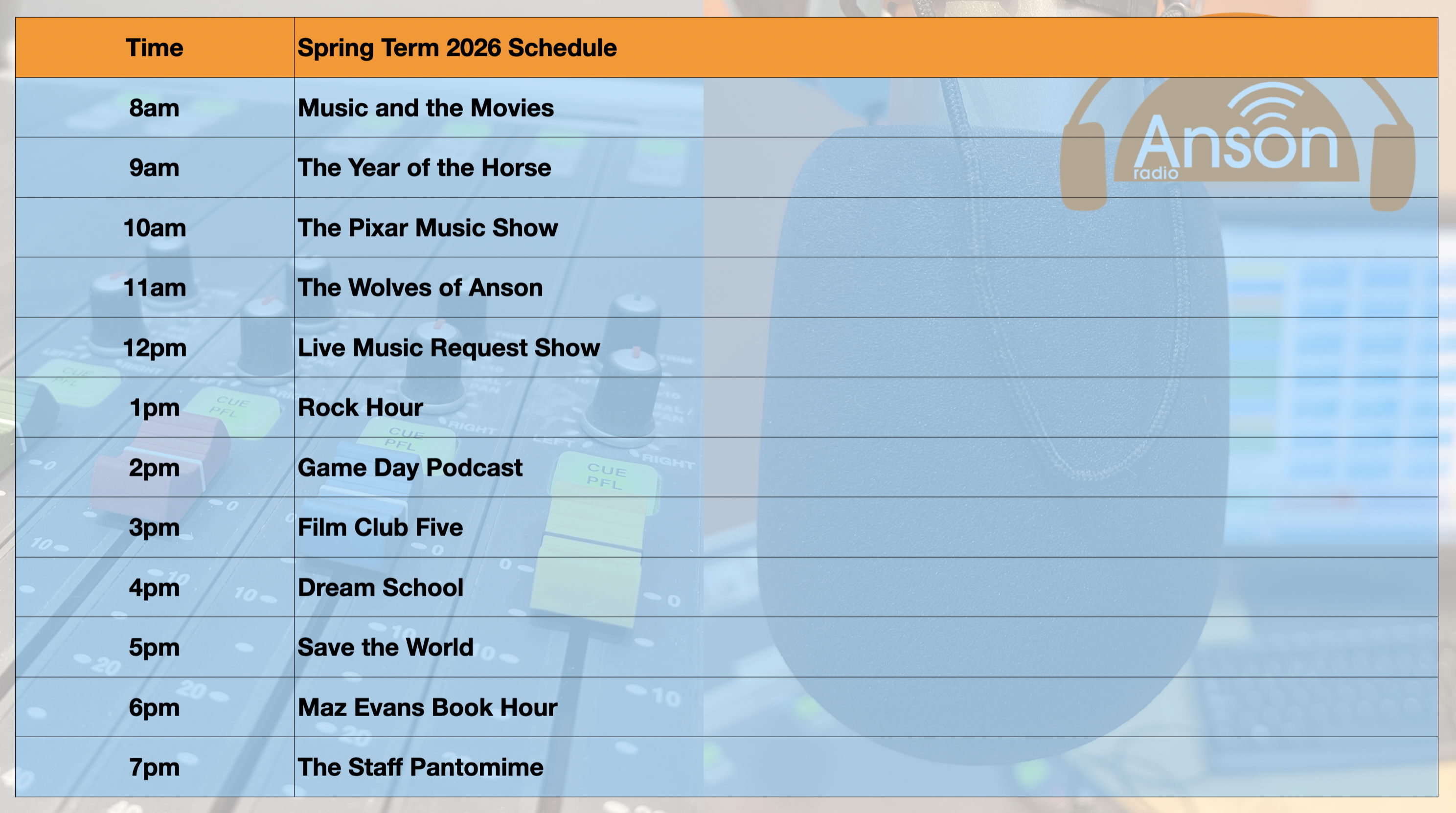 The radio station plays during term time, 24 hours a day, 7 days a week. You can access it on the TuneIn Radio Network or through the player below.