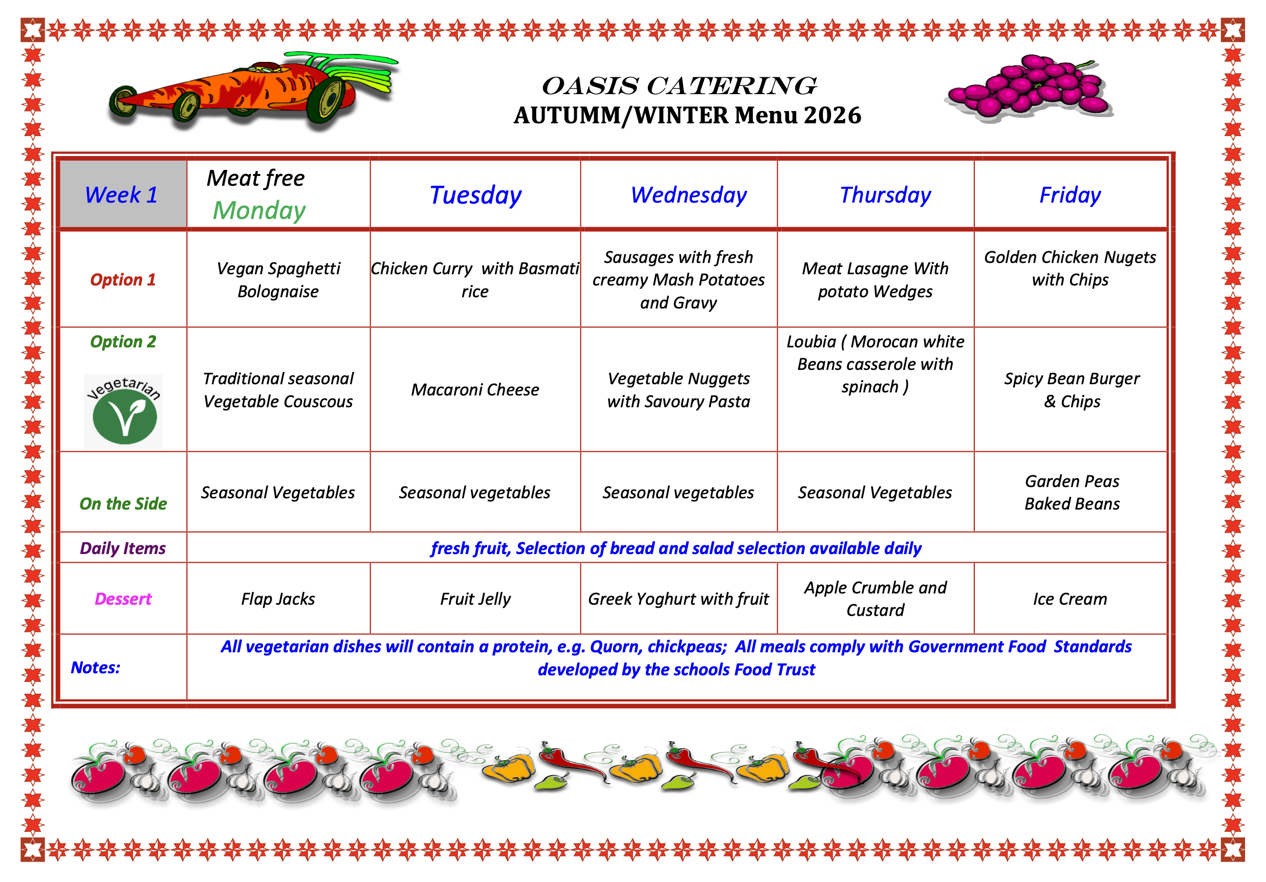 Oasis Catering provide freshly cooked meals for the children every day. Visitors to the school are always impressed by the quality of the food and we regularly monitor what is being served and the range of food on offer. We know the food is great value for money and offers a nutritious balanced diet.